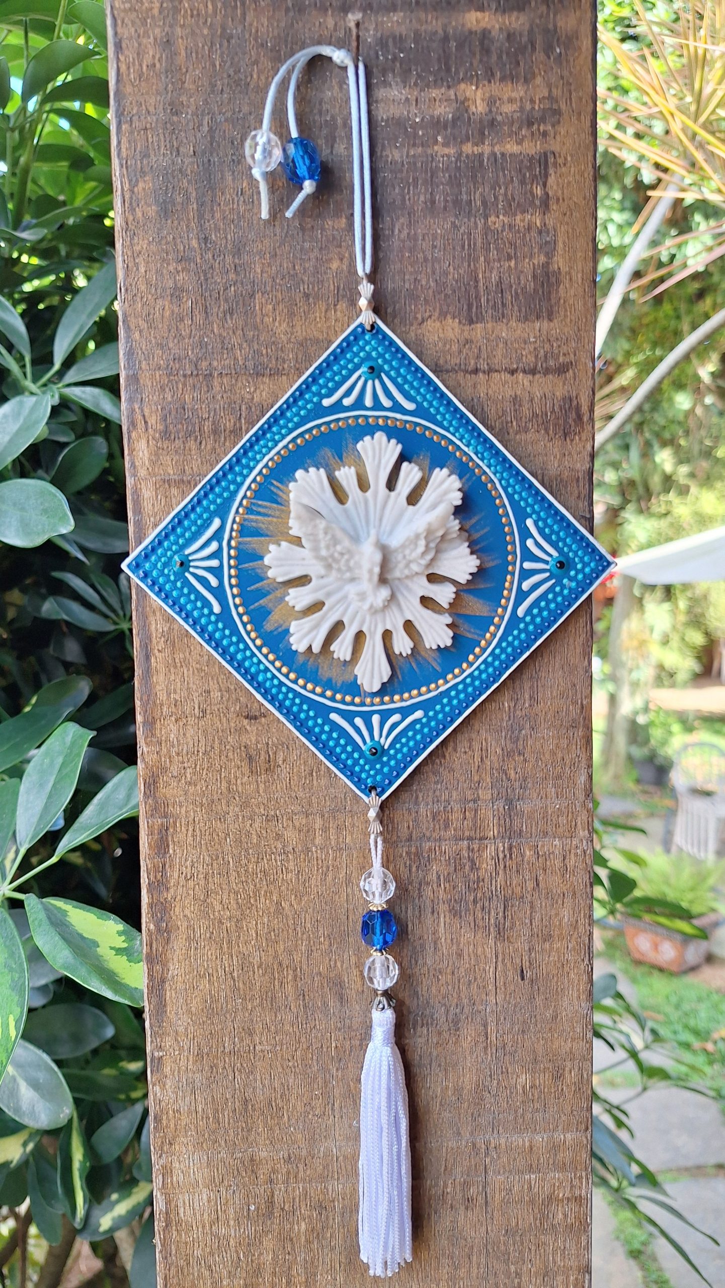 Esse delicado enfeite de parede traz a imagem do Divino Espírito Santo em relevo no centro, cercado por uma mandala azul celeste com pintura 3D em detalhes dourados e brancos.