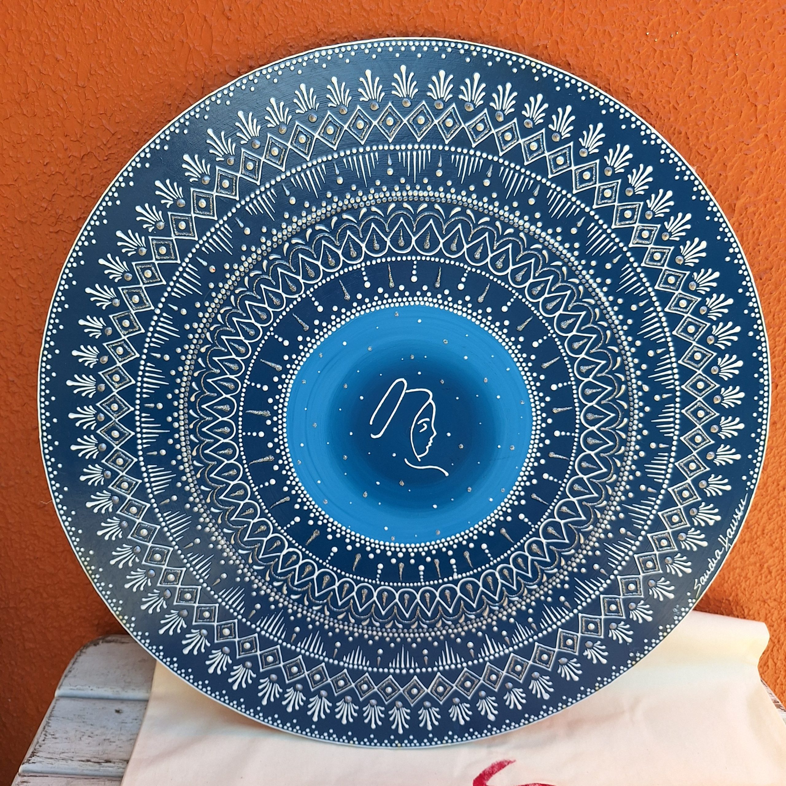 Essa mandala de 50 cm de diâmetro, feita em MDF de 6 mm, é uma verdadeira obra de arte espiritual. Pintada à mão em tons profundos de azul com detalhes brancos finamente pontilhados, ela transmite calma, proteção e serenidade.
