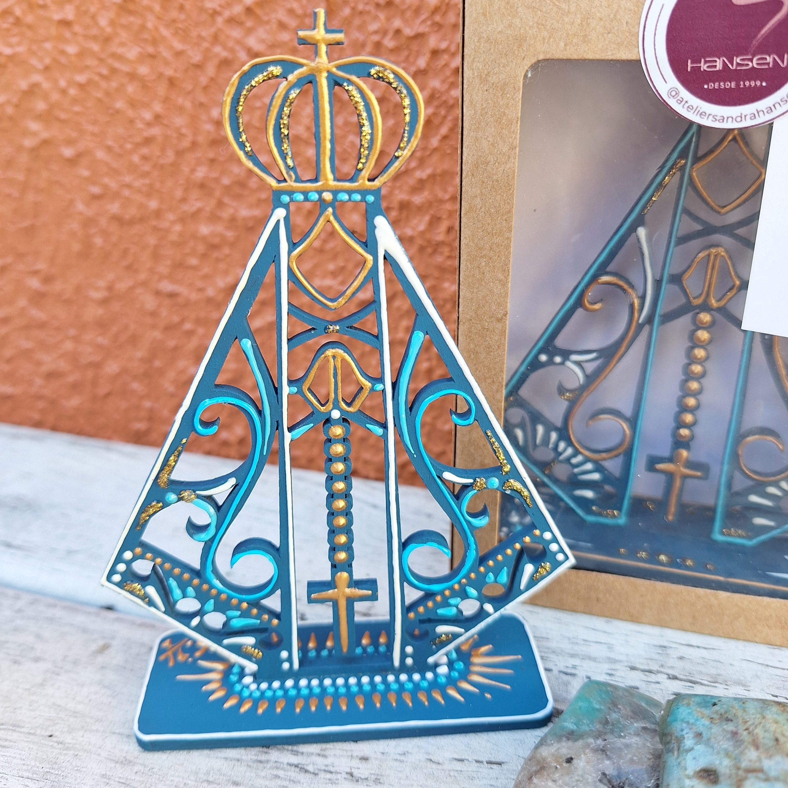 Essa versão da Nossa Senhora Aparecida, com recortes rendados e traços delicados, é uma verdadeira obra de arte devocional. Com 12 cm de altura por 7 cm de largura, ela é feita em MDF e pintada à mão em tons de azul, branco e dourado — cores que remetem à luz, à fé e à proteção espiritual.