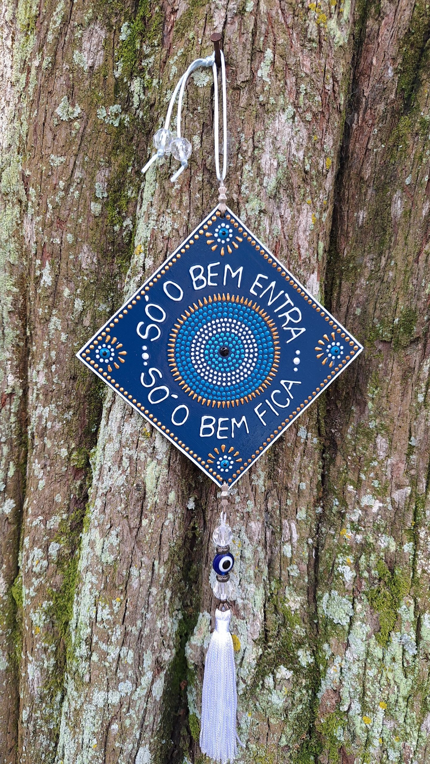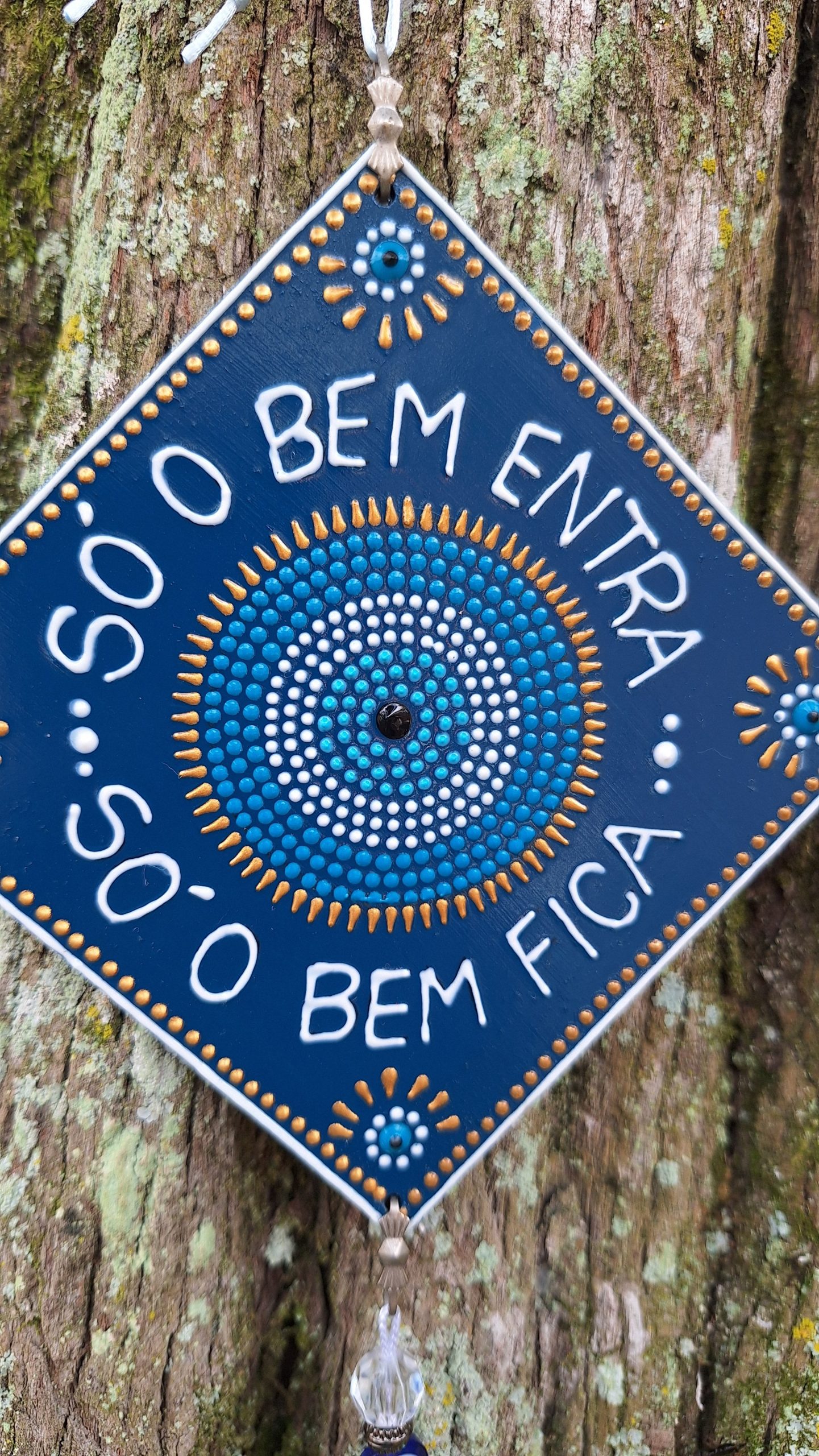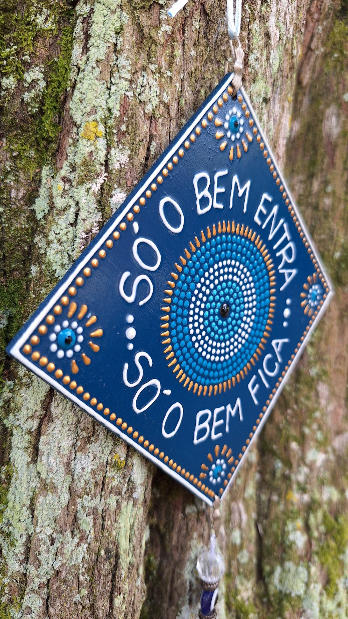 Essa delicada placa em formato losangular foi pintada à mão com tintas dimensionais 3D e carrega a mensagem poderosa: